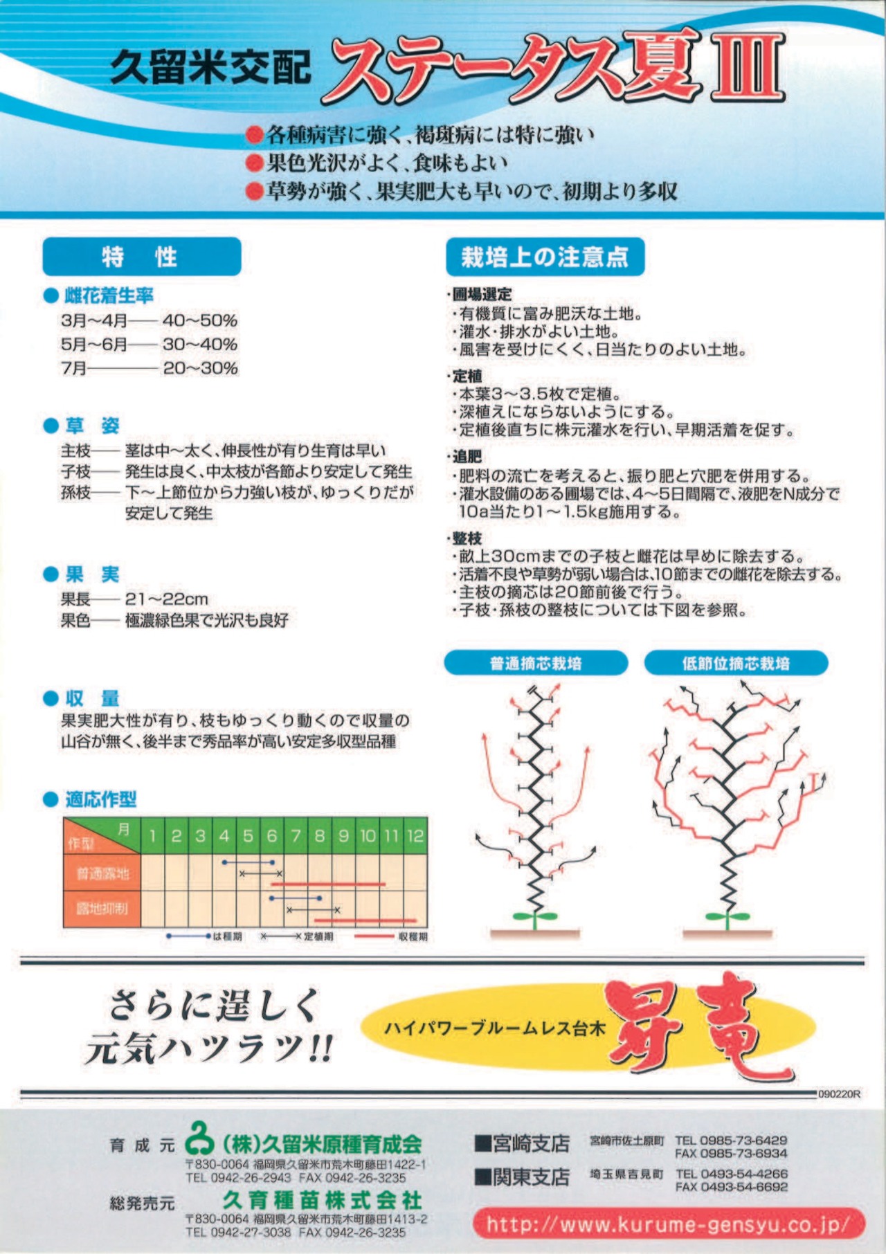 活着不良や草勢が弱い場合は、10節までの雌花を除去する。・主枝の摘芯は20節前後で行う。