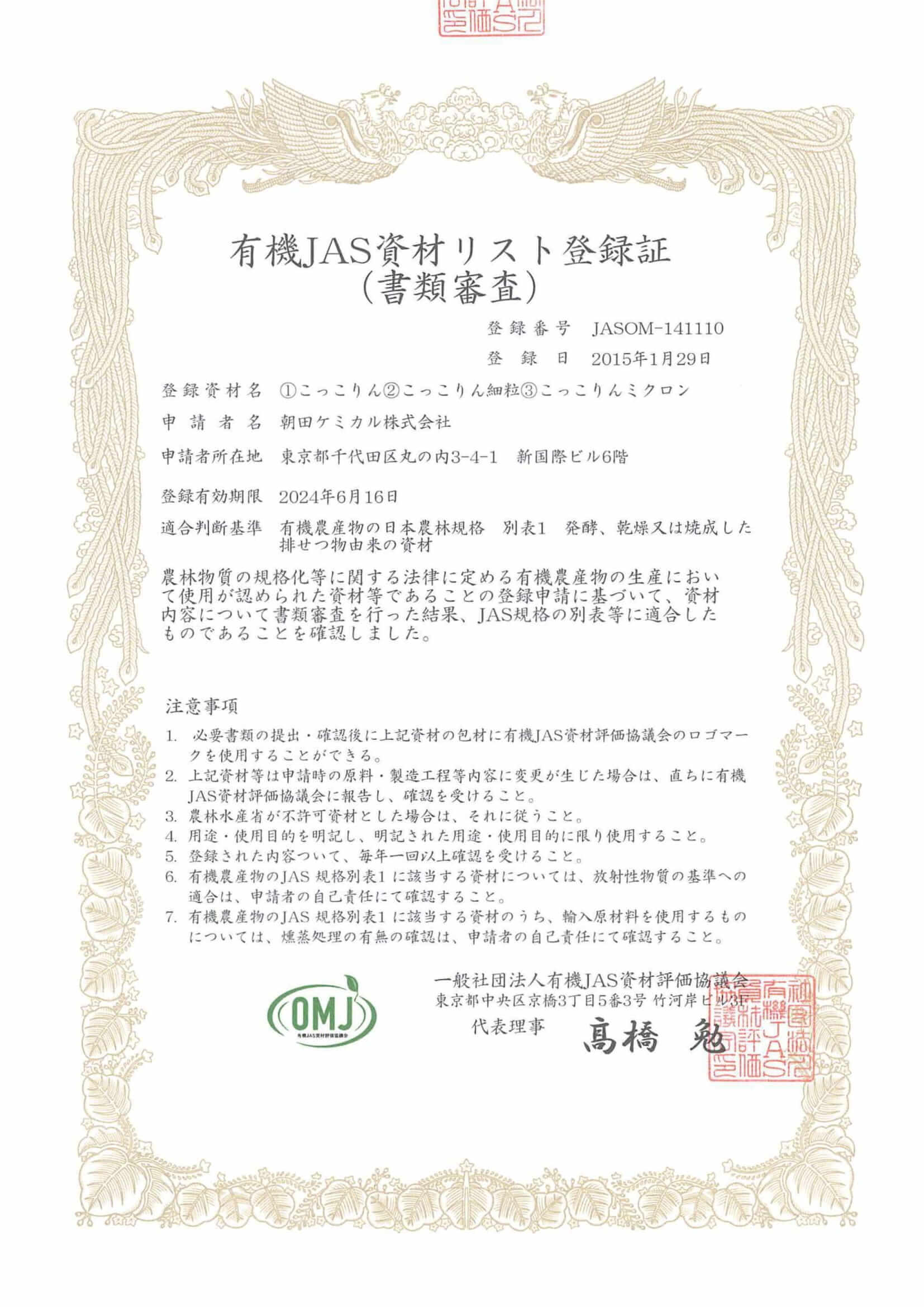 こっこりんは、厳選し契約した鶏卵農場さんだけから仕入れた鶏糞肥料を1200℃の超高温で焼成した「有機JAS別表1適合資材」のミネラル肥料です。