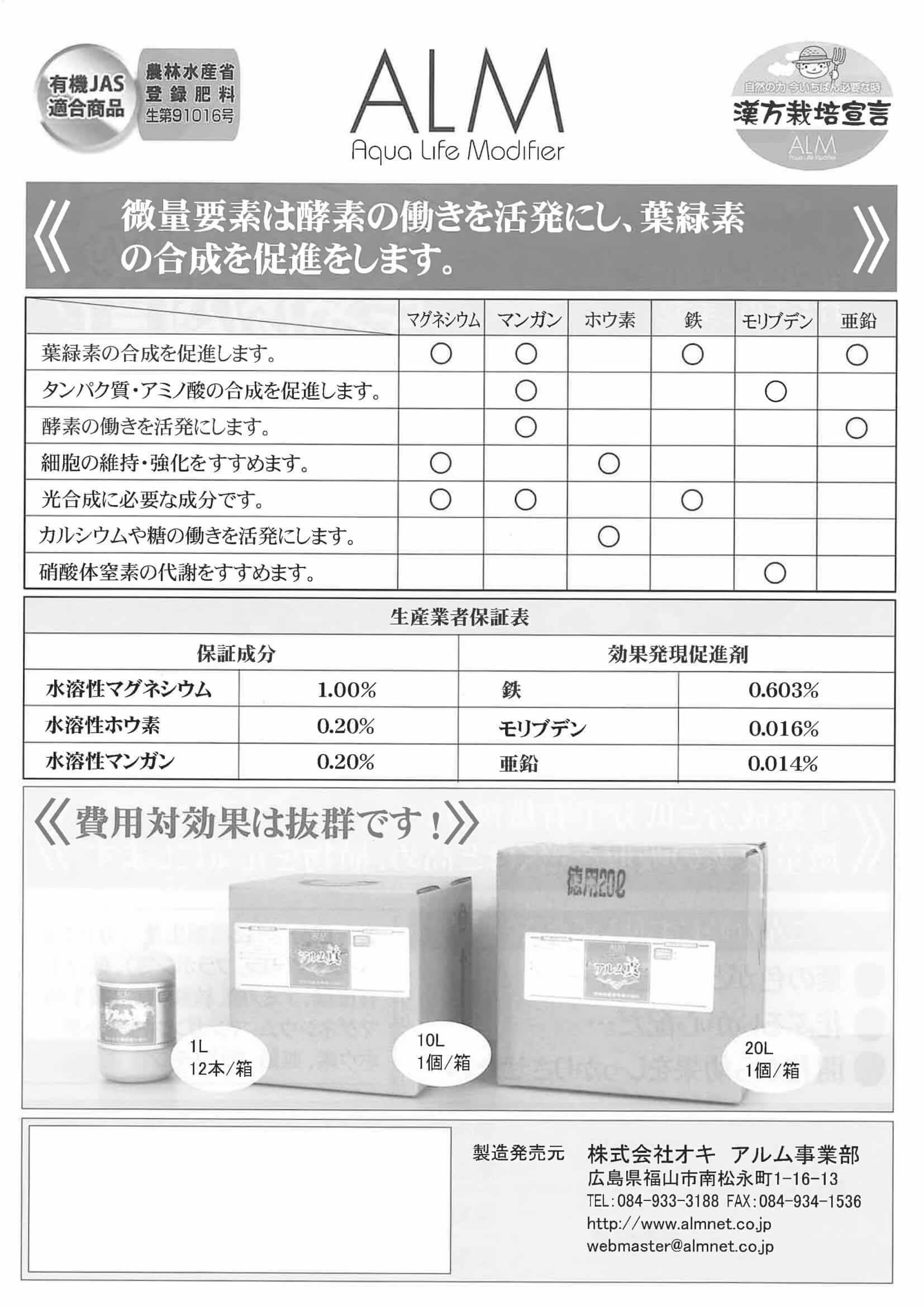 ・水耕栽培の場合は、溶液に入れて施用することになるので、高濃度活性剤「アルム純」、液体肥料要素複合肥料「アルム真」が使用能です。 地上部の葉面散布は液状タイプすべて使えます。アルム純の場合、300ミクロン以上のチューブ孔でしたら問題ありません。