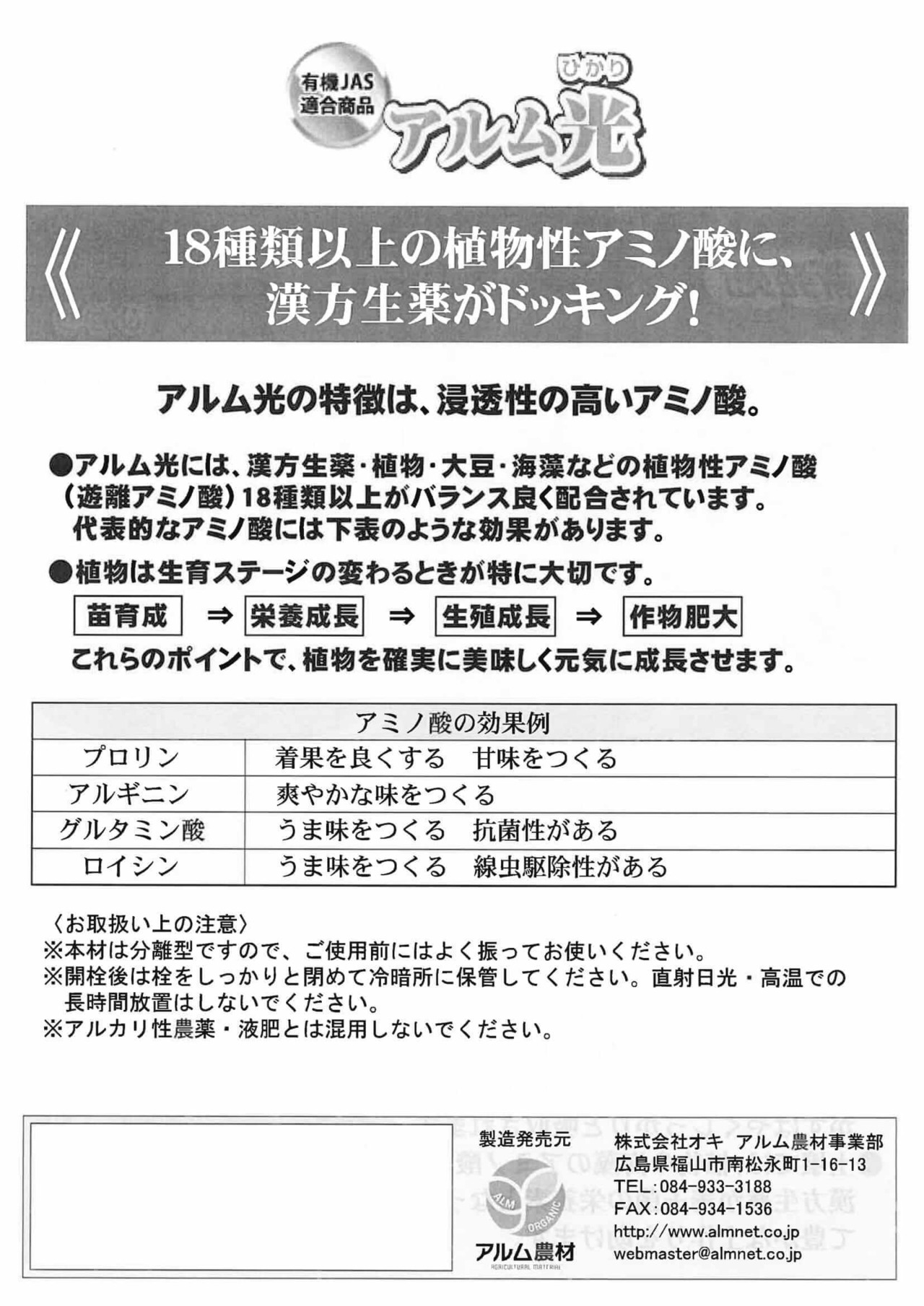 生薬発酵熟成液と天然アミノ酸(植物性)をブレンドしたオリジナルのアミノ酸資材。日照不足、味の向上などに即効性があります。