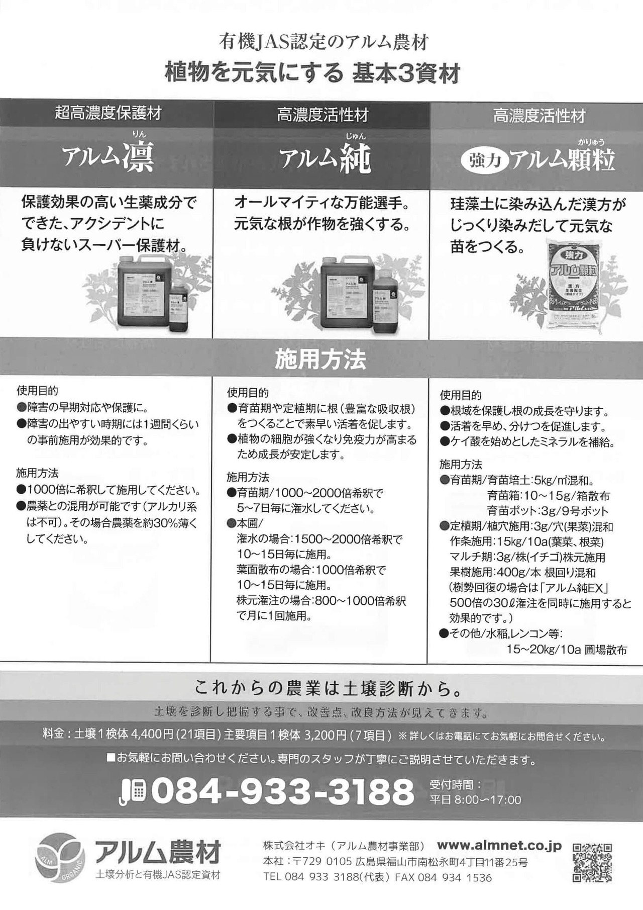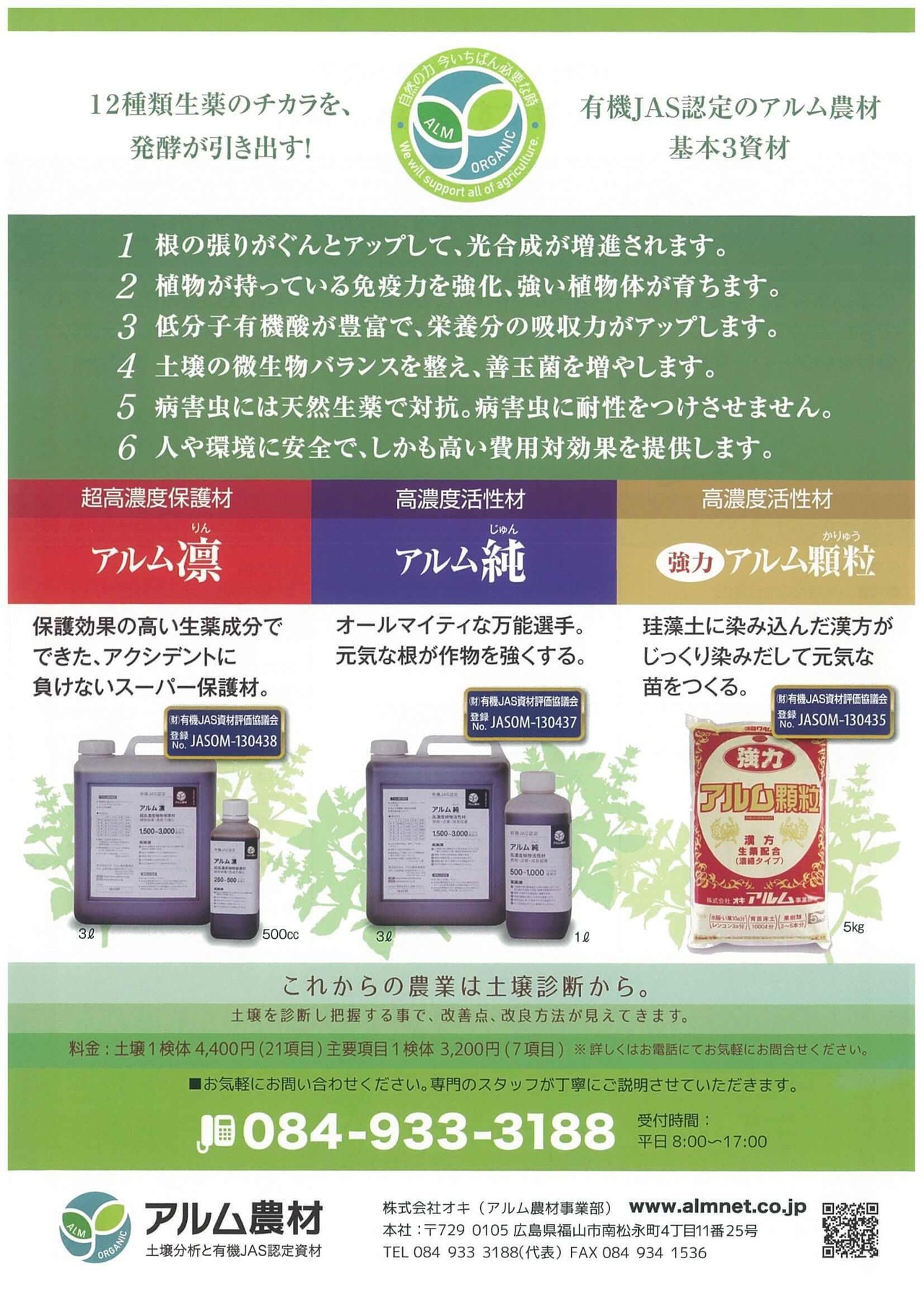 上記の方法で根を活性化させると同時に、光合成を促進させるために「アルム純」の葉面散布が効果的です。