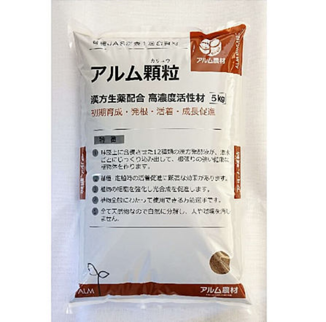 購入後の移植以降は、ストレスをなるべく少なくして本圃での生長を促すことが大切です。「アルム顆粒」(家庭用は「恵」)と「アルム純」を併用することで、本圃で素早く根を張り活着してくれます。 良い苗を生かすも殺すも移植から20日位までの管理が大切になります。この期間を素早く上手に成長させることがアルム材の特徴でもあります。