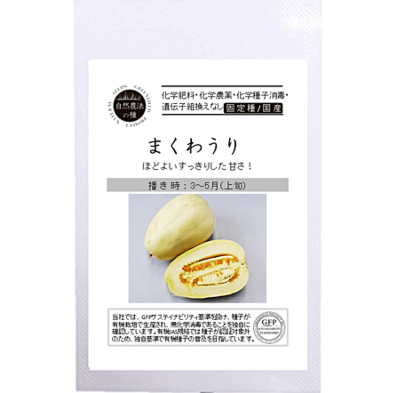 白皮・白肉の卵型で、すっきりした甘さが特徴のまくわうりです。自然農法の種で草勢強く大変育てやすい品種です。