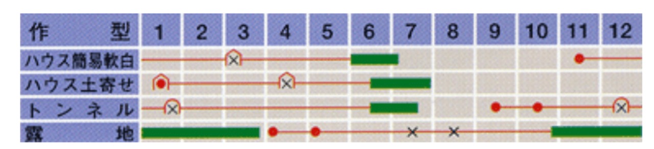 適作型は、4~5月蒔き、10~3月どり、9~10月蒔き、5~7月どり。