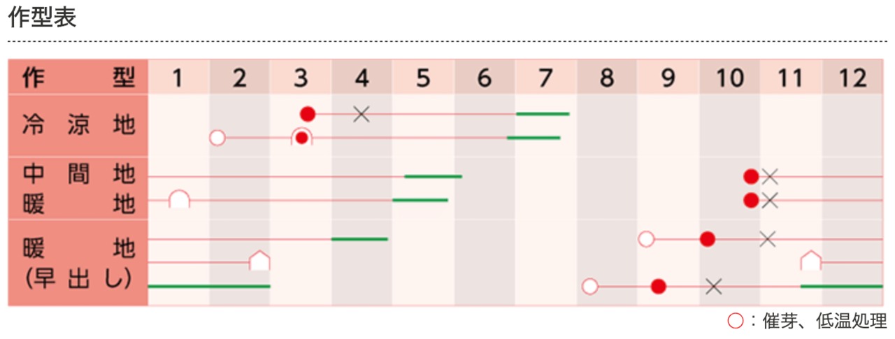 ・暖地(早出し):①4月収穫②11月収穫、12月収穫、1月収穫、2月収穫