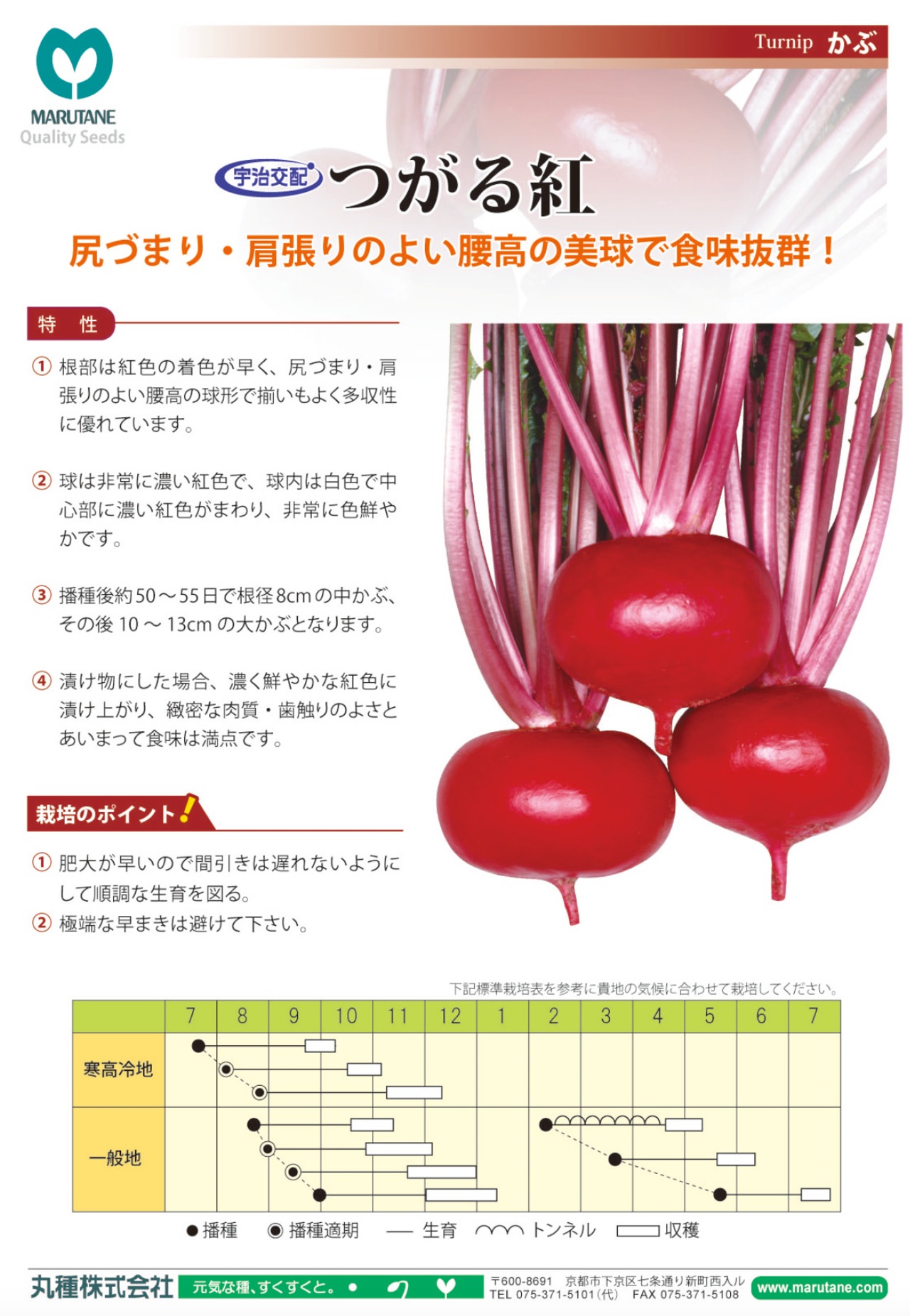 ・根部は紅色の着色が早く、尻づまり、肩はりの良い腰高の球形で、揃いよく、多収性に優れています。