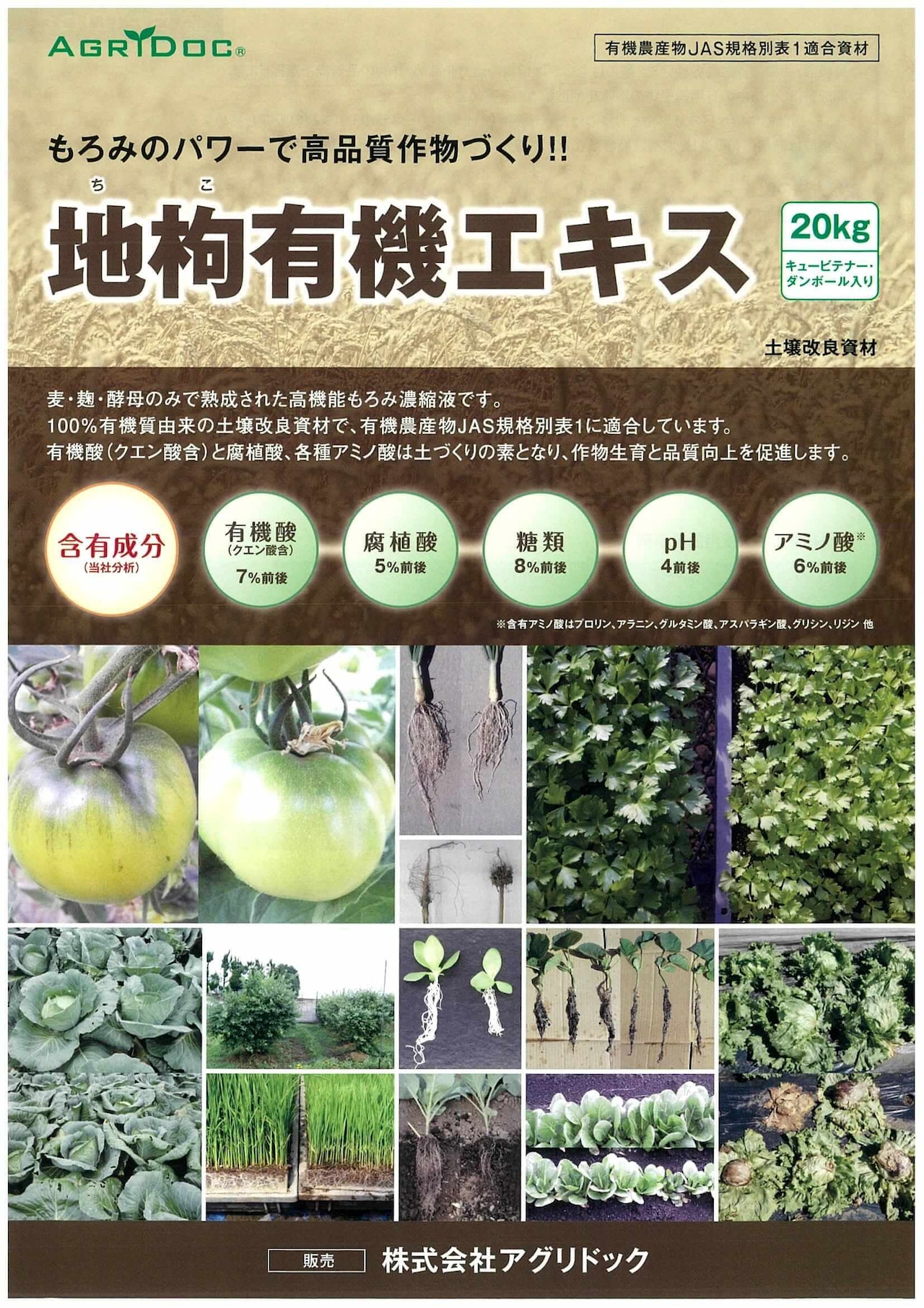 100%有機質由来の土壌改良資材で、有機農産物JAS規格別表1に適合しています。
