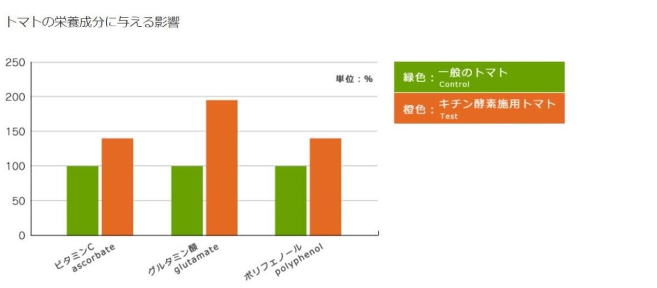 ・キチン酵素を使用した作物は、棚もちがよくなり、旨味の増加する傾向がありますが、実際に作物の機能成分を測定してみると、ビタミン類やポリフェノールなどの抗酸化成分が増加する傾向があります(グラフ参照)。