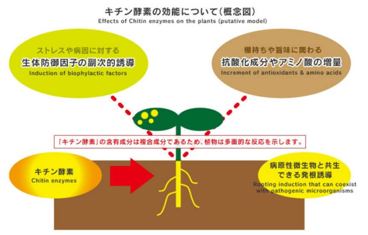 キチン酵素は、耐熱性・耐酸性キチナーゼ・キトサナーゼ酵素、分子シャペロンなどを利用した資材です。