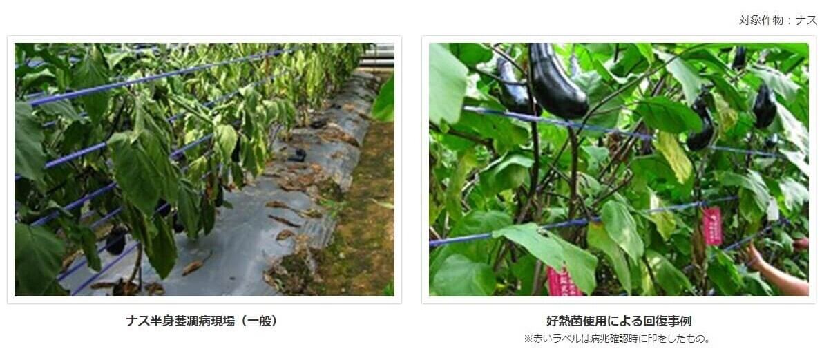 ナスの半身萎凋病になると、左上の写真のようになるが、キチン酵素を施用した現場では、右上の写真のように、ナスの収穫が可能となるばかりでなく、A級品の収穫まで可能となった。