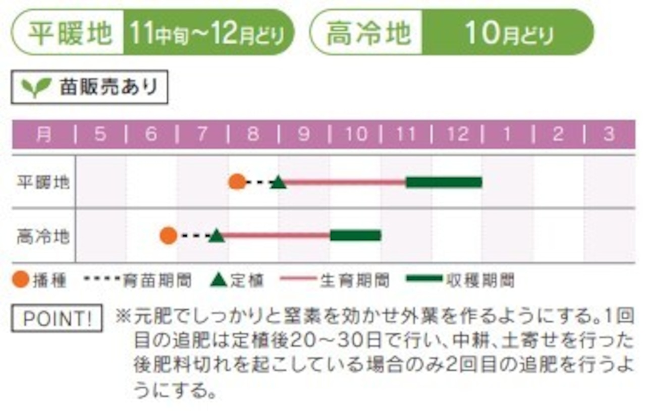 平暖地:11月収穫・12月収穫、高冷地:10月収穫