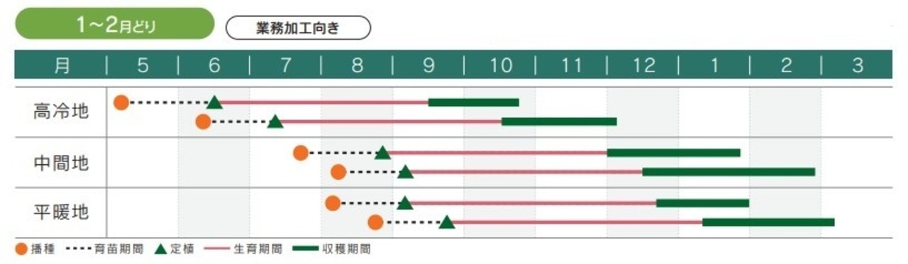 高冷地:9月収穫・10月収穫・11月収穫・12月収穫、中間地:12月収穫・1月収穫・2月収穫、平暖地:12月収穫・1月収穫・2月収穫・3月収穫