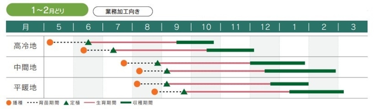 高冷地:9月収穫・10月収穫・11月収穫・12月収穫、中間地:12月収穫・1月収穫・2月収穫、平暖地:12月収穫・1月収穫・2月収穫・3月収穫