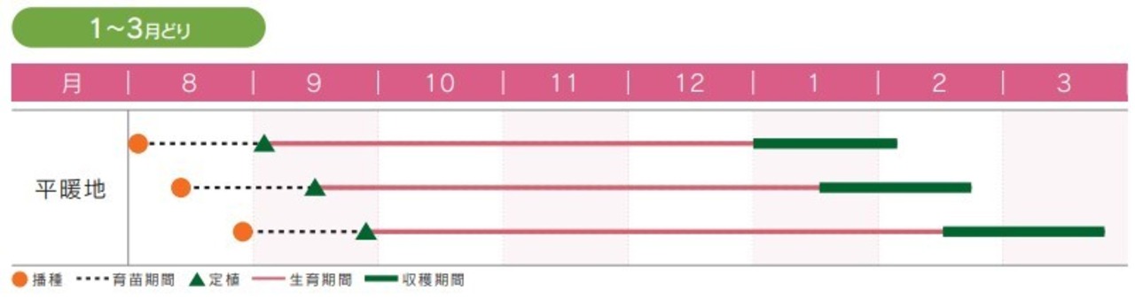 ・8月上~下旬播種、1月上~3月下旬収穫に適する春系。