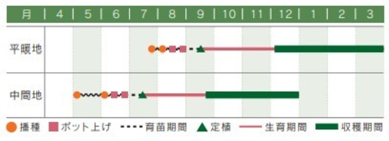 平暖地:7月播き・8月播き、中間地:5月播き・6月播き