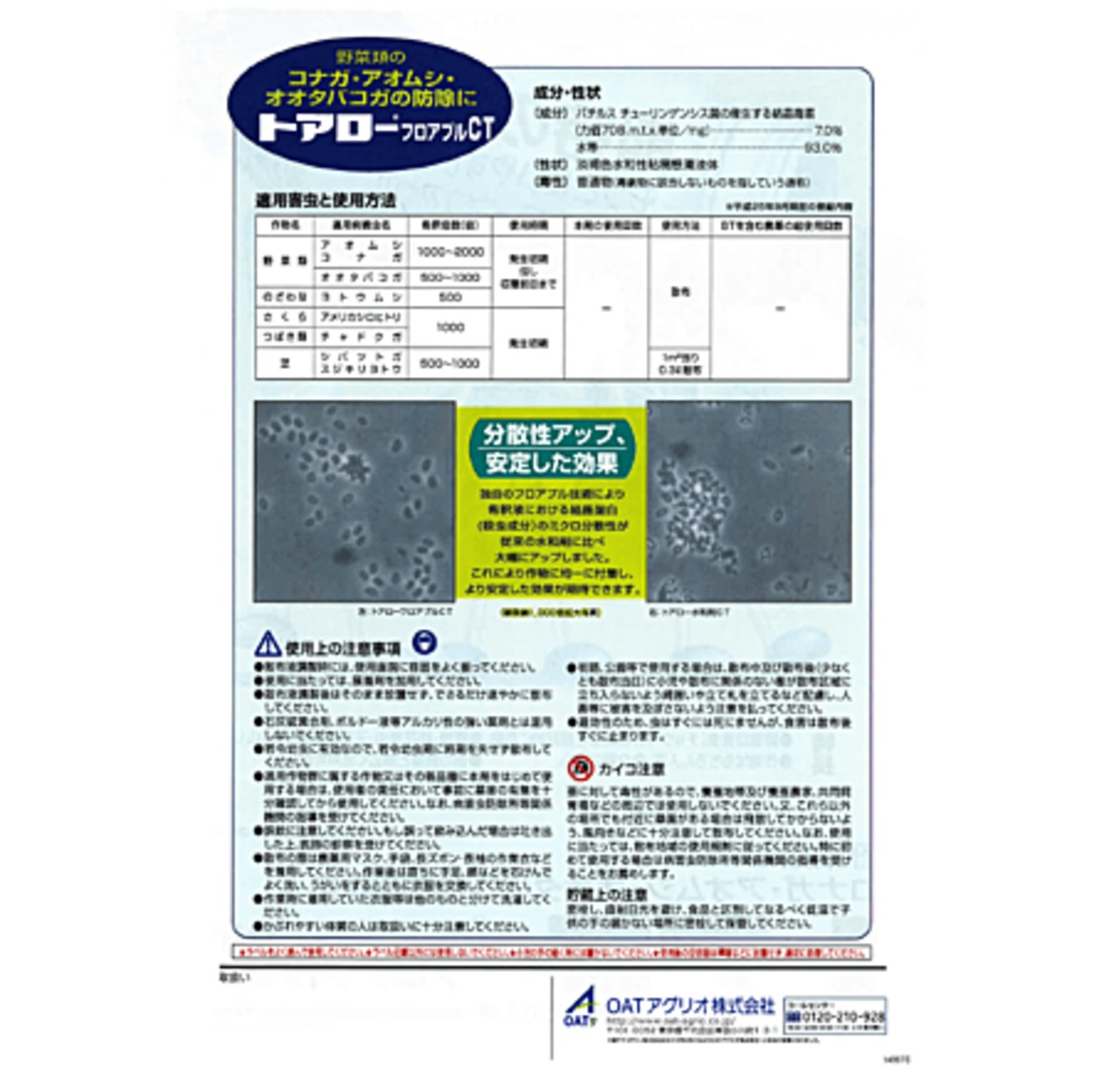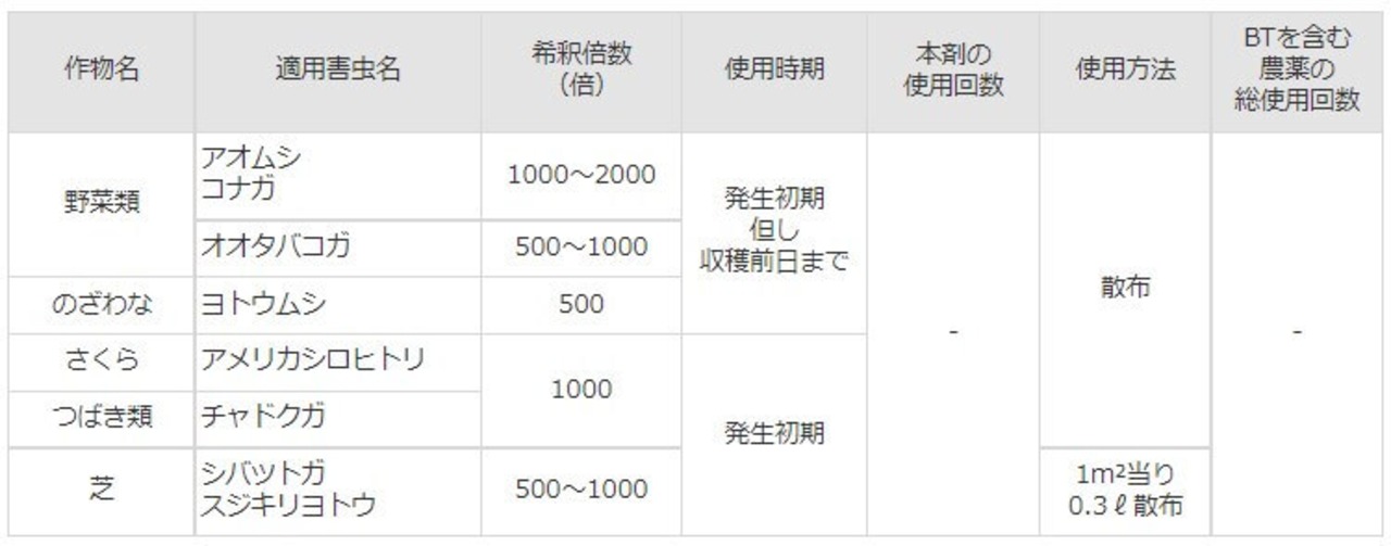 BT菌の中でもコナガに対して殺虫活性の高いクルスターキ株を100%使用し、その結晶毒素を7%含有しているので、コナガに対して確実な効果が得られます。