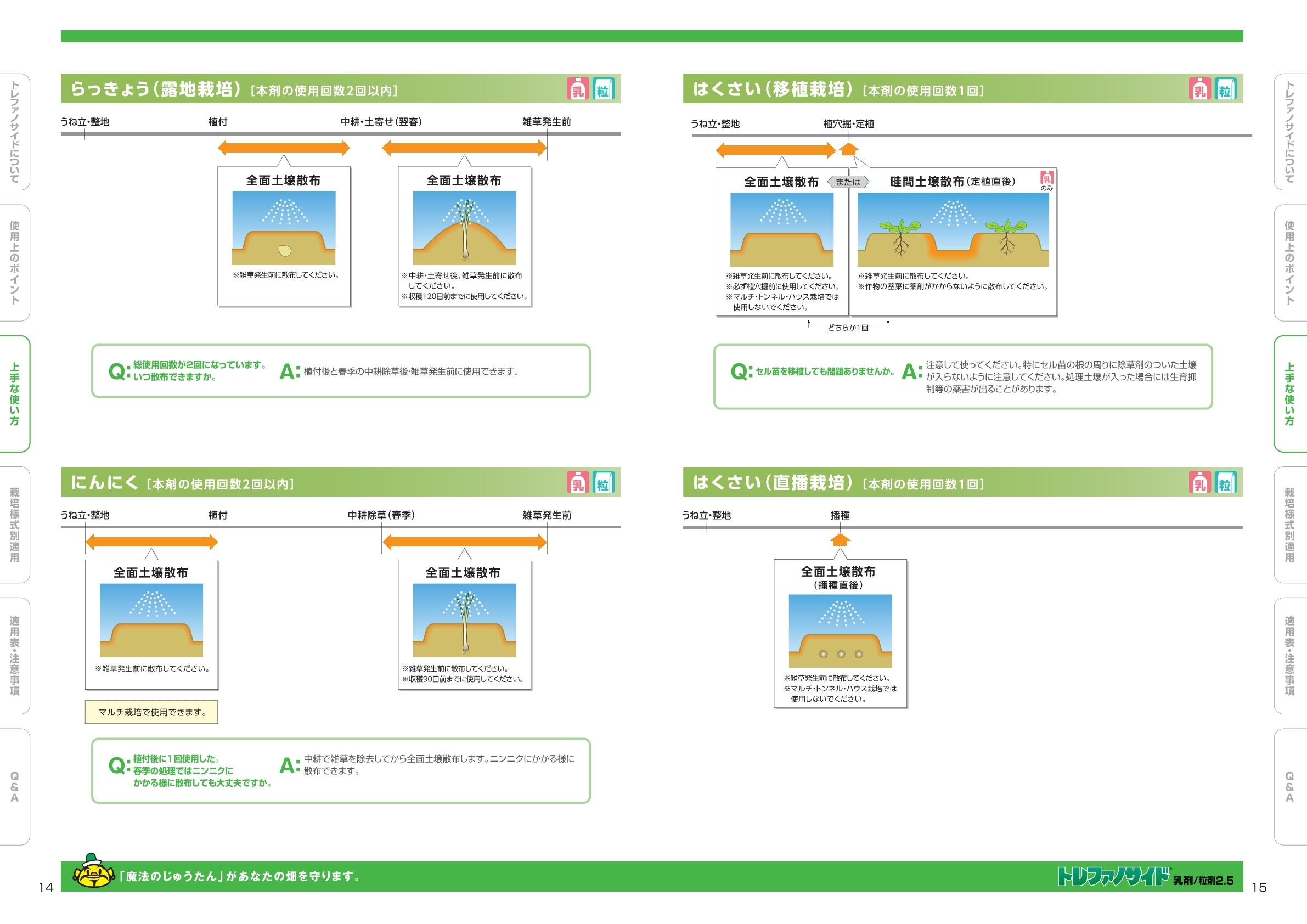 ・土壌が非常に乾燥しているときは、効果が劣る場合があるので、土壌を適当に湿らせるか、降雨の後に散布を行ってください。/p>