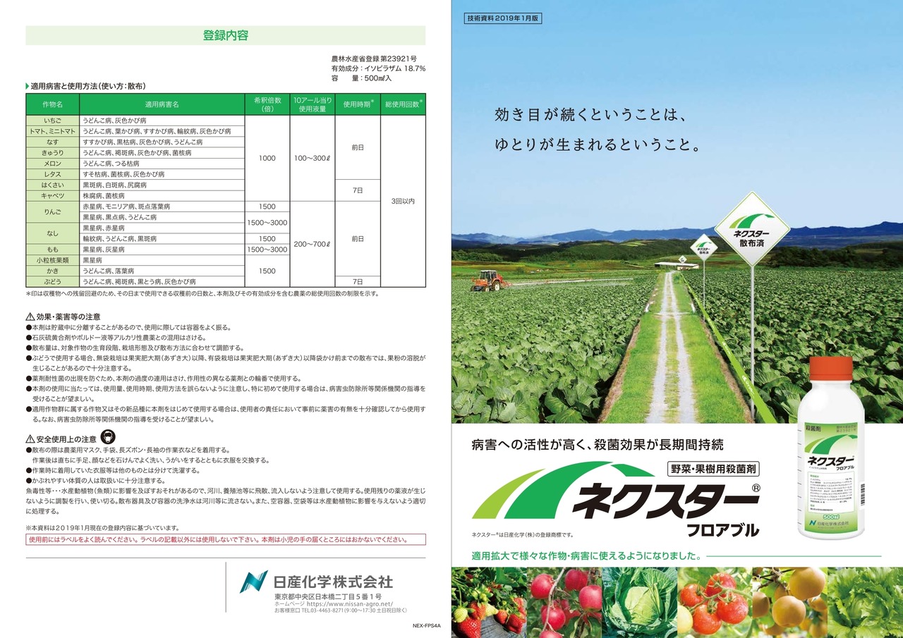 ・適用作物群に属する作物又はその新品種に本剤をはじめて使用する場合は、使用者の責任において事前に薬害の有無を十分確認してから使用してください。なお、病害虫防除所等関係機関の指導を受けることが望ましいです。