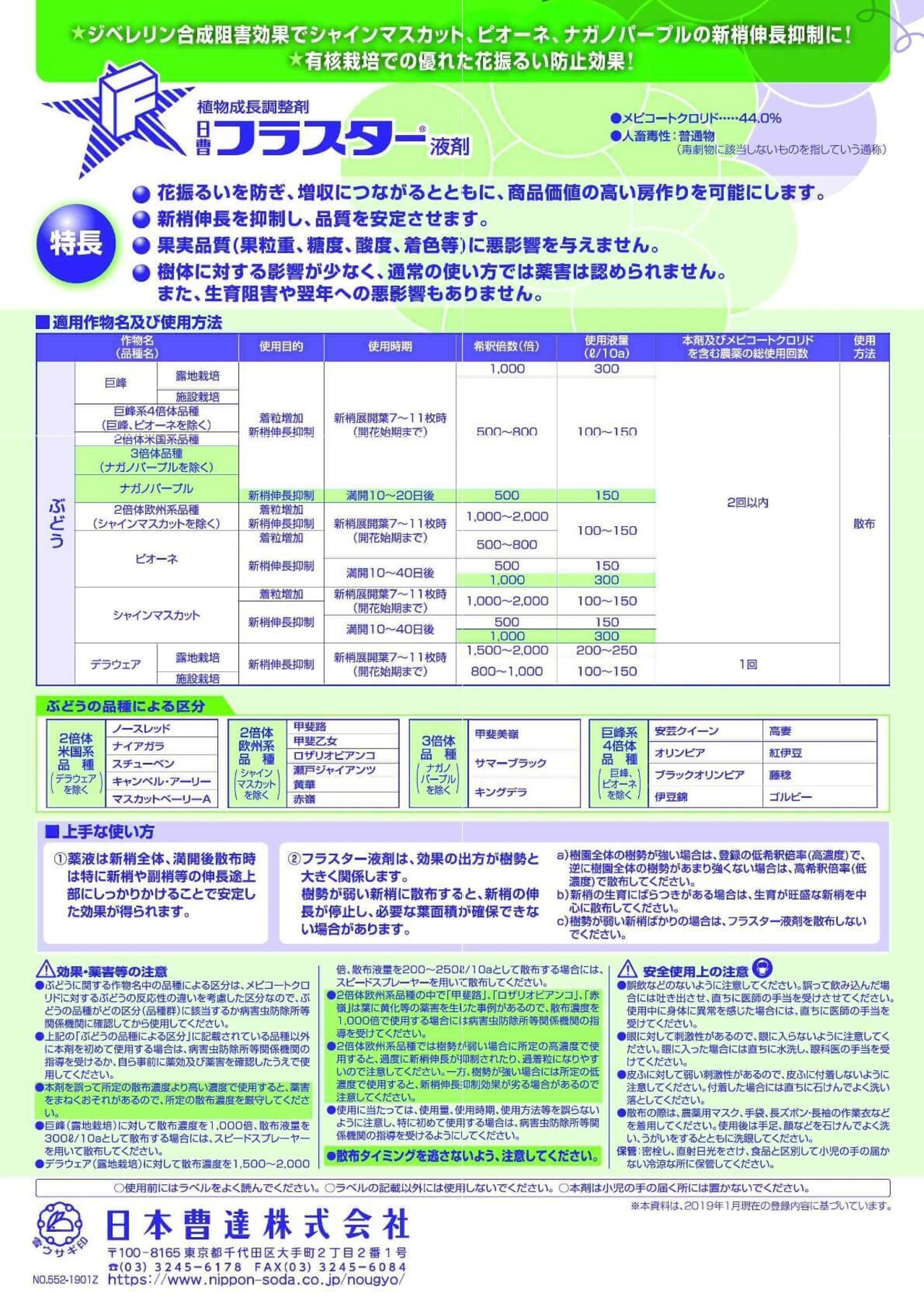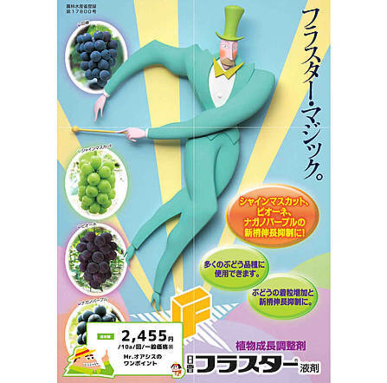 ●ジベリン合成阻害効果でシャインマスカット、ピオーネ、ナガノパープルの新梢伸長抑制に!有核栽培での優れた花振るい防止効果!