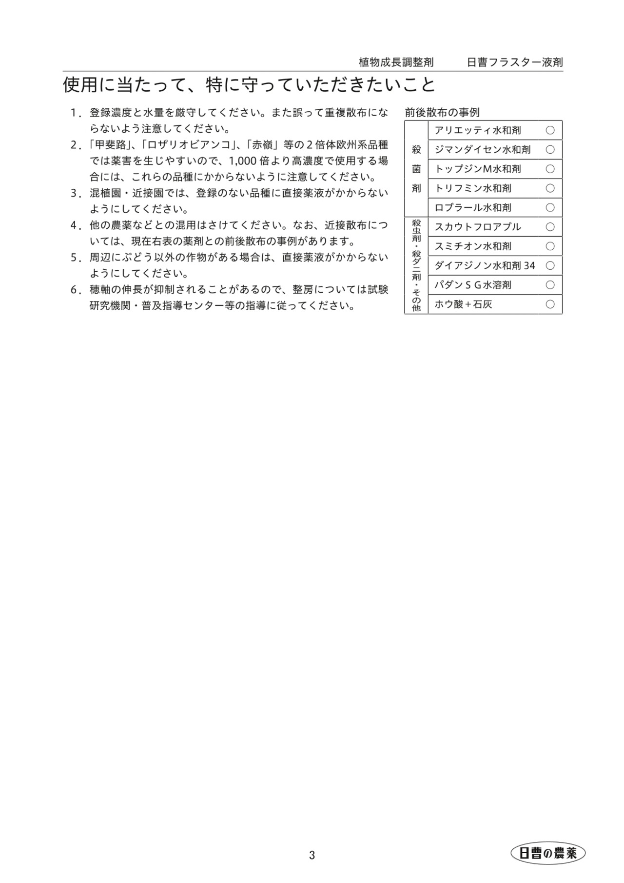 ・樹体に対する影響が少なく、通常の使い方では薬害は認められません。また、生育阻害や翌年への悪影響もありません。