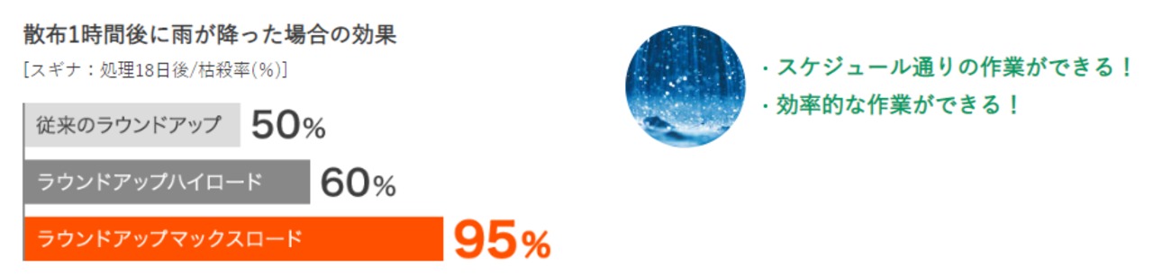 [従来のラウンドアップ]が散布後6時間以内の降雨に効果が劣る場合があるのに対し、[ラウンドアップマックスロード]なら散布後1時間経てば確かな効果を発揮します。