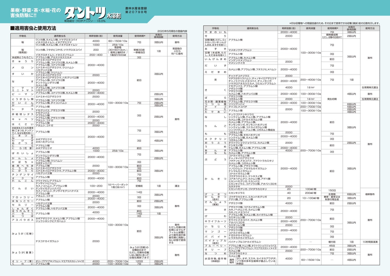 ・散布量は対象作物の生育段階、栽培形態および散布方法に合わせ調節する。